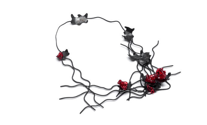 My present line of work-Terra- reflects upon the effect of Man on Nature. Living in a small agricultural community, I witness the growingly negative effect of unsustainable farming on the environment. Irresponsible use of pesticides, genetically engineered crops, inadequate waste disposal: all of these lead to destruction and disease. In my pieces I combine recycled plastic with metal to depict fields that used to be green but turned black, void, desolate, bearing fruits of pain and blood.